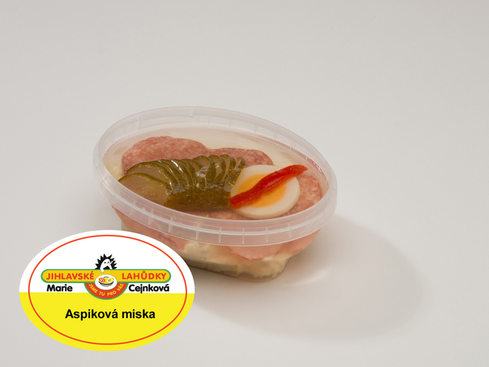 Složení: aspik minimální množství 45% (voda, ocet, želatina, cukr, sůl), bramborová pomazánka (brambory, majonéza /řepkový olej, voda, vaječné žloutky, ocet, zahušťovadla //modifikovaný škrob, guma guar, xanthan, karubin//, sůl, konzervant E202/, sterilovaná cuketa /cuketa, voda, ocet, cukr, sůl, extrakt koření/, cibule, hořčice plnotučná /voda, hořčičné semínko, ocet, cukr, sůl, konzervant E211, barvivo E160a/, sůl, cukr, worcestr omáčka /voda, ocet, cukr, sůl, víno, švestková povidla //švestky, jablka, pektin, E330//, směs koření, barvivo E150d, sušený rajčatový protlak, aromata, chilli extrakt, česnekový extrakt/, směs koření, bioprotektor a antioxidant Biamex 012 /směs kyselých mléčných kultur, uhlohydrátů, soli a výtažků z koření/), salám vysočina (vepřové maso a sádlo, hovězí maso, vepřové kůže /stabilizátor E466/, sůl, konzervant E250, směs koření /červená řepa, dextróza, stabilizátor E450, E451, látka zvýrazňující chuť a vůni E621, antioxidant E300, modifikovaný škrob E1450, koření, barvivo E120/), sterilované okurky řezy a červená paprika (zelenina, voda, ocet, sůl, extrakt koření, sladidlo E954), vejce (nálev: regulátor kyselosti E260,E270, E330, antioxidant E325, ocet).