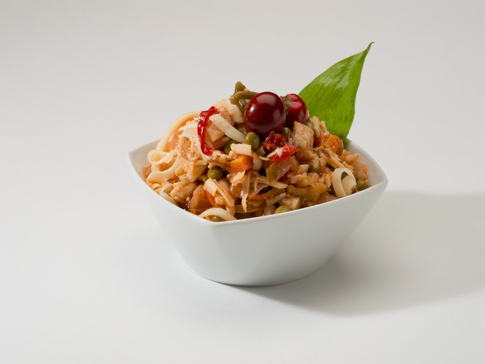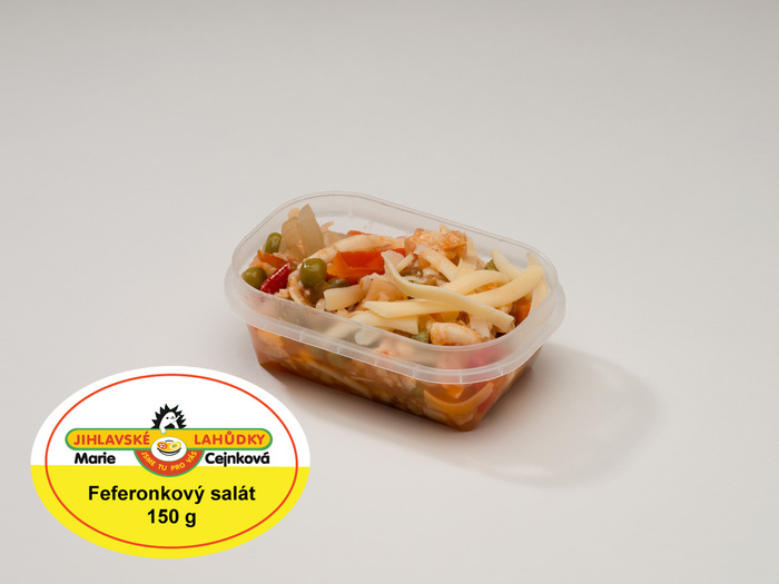 Složení: sýr Eidam, sterilovaný zeleninový salát (cibule, paprika, mrkev, celer, voda, ocet, cukr, sůl, extrakt koření, antioxidant E330), sterilovaná cibule, hrách, paprika červená a feferonky minimální množství 1% (zelenina, voda, ocet, sůl, extrakt koření, antioxidant E330 a disiřičitan sodný, sladidlo E954), řepkový olej, kečup (voda, rajčatový protlak, cukr, ocet, zahušťovadlo modifikovaný škrob E1422, sůl, koření, konzervant E211), cukr, sůl, worcestr omáčka (voda, ocet, cukr, sůl, víno, švestková povidla /švestky, jablka, pektin, E330/, směs koření, barvivo E150d, sušený rajčatový protlak, aromata, chilli extrakt, česnekový extrakt), směs koření, bioprotektor a antioxidant Biamex 012 (směs kyselých mléčných kultur, uhlohydrátů, soli a výtažků z koření).