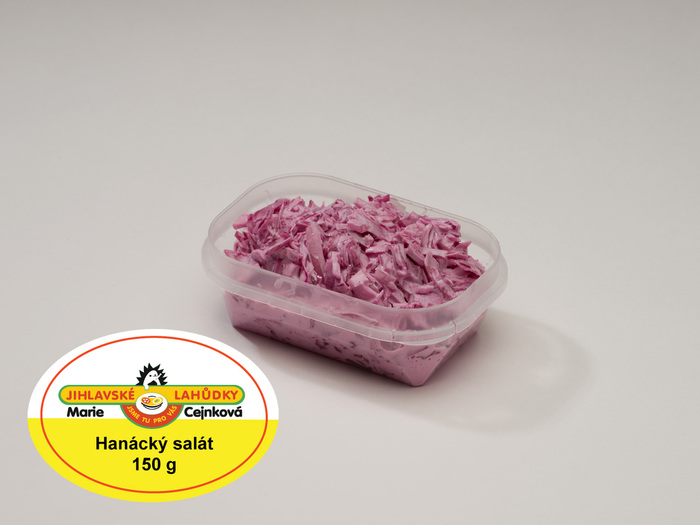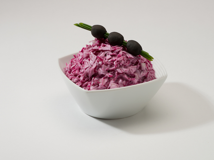 Složení: sterilované červené zelí (zelí, voda, ocet, sůl, extrakt koření, antioxidant E330 a disiřičitan sodný, sladidlo E954), majonéza (řepkový olej, voda, vaječné žloutky, ocet, zahušťovadla /modifikovaný škrob, guma guar, xanthan, karubin/, sůl, konzervant E202), cibule, cukr, sůl, bioprotektor a antioxidant Biamex 012 (směs kyselých mléčných kultur, uhlohydrátů, soli a výtažků z koření).