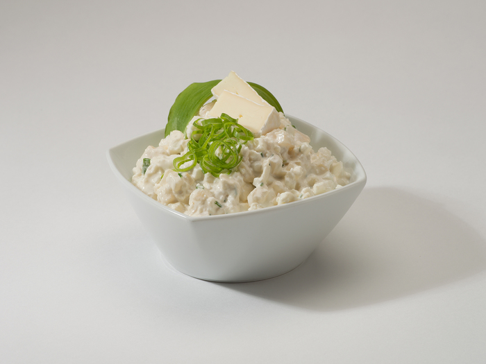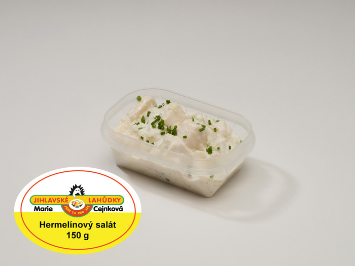 Složení: vaječný bílek vařený, Hermelín minimální množství 20%, majonéza (řepkový olej, voda, vaječné žloutky, ocet, zahušťovadla /modifikovaný škrob, guma guar, xanthan, karubin/, sůl, konzervant E202), sterilovaný celer (celer, voda, ocet, sůl, extrakt koření, antioxidant E330 a disiřičitan sodný, sladidlo E954), pór, sůl, bioprotektor a antioxidant Biamex 012 (směs kyselých mléčných kultur, uhlohydrátů, soli a výtažků z koření).
