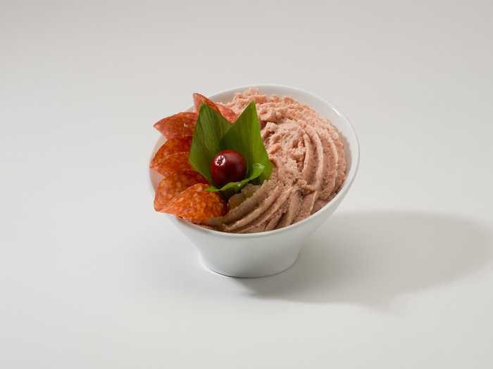 Složení: špekáčky (vepřové maso, sádlo, voda, vepřové kůže /stabilizátor E466/, sůl, konzervant E250, zahušťující směs /vláknina, škrob, modifikovaný škrob E1420, zahušťovadlo E415, E412/, škrob, směs koření /stabilizátor E450, E451, zvýrazňovač chuti E621, dextróza, emulgátor E471, antioxidant E300, barvivo E150c, E162, E120, česnek), Tavená pomazánka (voda, rostlinné tuky /palmový, shea, řepkový, kokosový, slunečnicový a sójový/, sýry, syrovátka, mléko, škrob, tavící soli E452, E450, E341, E339, aroma, sůl, stabilizátor E407, regulátor kyselosti E330, barvivo E160a), tuk ZeLa (neztužené a částečně ztužené rostlinné oleje /palmový, řepkový/, voda, emulgátory E322, E471, odstředěné mléko, aroma, konzervant E202, antioxidanty E320, E310, kyselina E330, barvivo E160a, vitamin A), cibule, sterilované feferonky (feferonky, voda, ocet, sůl), hořčice plnotučná (voda, hořčičné semínko, ocet, cukr, sůl, konzervant E211, barvivo E160a), sůl, bioprotektor a antioxidant Biamex 012 (směs kyselých mléčných kultur, uhlohydrátů, soli a výtažků z koření).