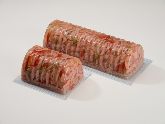 Složení: aspik minimální množství 55% (voda, ocet, želatina, cukr, sůl), výrobní salám (drůbeží maso strojně oddělené 38%, voda, vepřové kůže, bramborový škrob, sůl, stabilizátor E450, E451, E250, barvivo E120, E150c, antioxidant E300, E301, E330, zvýrazňovač chuti E621, protispékavá látka E551, dextróza, koření, aroma), cibule, sterilovaná paprika červená a hrách (zelenina, voda, ocet, sladidlo sacharin, sůl, extrakt koření).