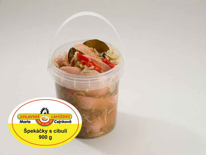 Složení: špekáčky 400 g (vepřové maso 55% a sádlo, voda, vepřové kůže /stabilizátor E466/, sůl, konzervant E250, zahušťující směs /vláknina, škrob, modifikovaný škrob E1420, zahušťovadlo E415, E412/, škrob, směs koření /stabilizátor E450, E451, koření, zvýrazňovač chuti E621, dextróza, emulgátor E471, antioxidant E300, barvivo E150c, E162, E120/, česnek), nálev 0,3 l (voda, ocet, cukr, sůl, bobkový list, nové koření, pepř černý), cibule 100 g, sterilované okurky a paprika červená (zelenina, voda, ocet, sladidlo sacharin, sůl, extrakt koření), řepkový olej.