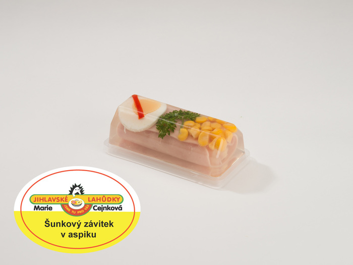 Složení: aspik minimální množství 40% (voda, ocet, želatina, cukr, sůl), vlašský salát (výrobní salám /drůbeží maso strojně oddělené 38%, voda, vepřové kůže, bramborový škrob, sůl, stabilizátor E450, E451, E250, barvivo E120, E150c, antioxidant E300, E301, E330, zvýrazňovač chuti E621, protispékavá látka E551, dextróza, koření, aroma/, majonéza /řepkový olej, voda, vaječné žloutky, ocet, zahušťovadla //modifikovaný škrob, guma guar, xanthan, karubin//, sůl, konzervant E202/, brambory, sterilovaná cuketa, hrách, mrkev a celer /zelenina, voda, ocet, cukr, sůl, antioxidant E330 a disiřičitan sodný, sladidlo E954, extrakt koření/, hořčice plnotučná /voda, hořčičné semínko, ocet, cukr, sůl, konzervant E211, barvivo E160a/, cukr, worcestr omáčka /voda, ocet, cukr, sůl, víno, švestková povidla //švestky, jablka, pektin, E330//, směs koření, barvivo E150d, sušený rajčatový protlak, aromata, chilli extrakt, česnekový extrakt/, sůl, směs koření, bioprotektor a antioxidant Biamex 012 /směs kyselých mléčných kultur, uhlohydrátů, soli a výtažků z koření/) šunka vepřová minimální množství 20% (vepřová kýta 70%, voda, sůl, konzervant E250, želírující látky E407, E407a, zahušťovadlo E425, stabilizátor E451, E450, cukr, antioxidant E301, E316, E331, zvýrazňovač chuti E621), sterilovaná kukuřice a paprika červená (zelenina, voda, ocet, cukr, sůl, extrakt koření), vejce (nálev: regulátor kyselosti E260, E270, E330, antioxidant E325, ocet), zelená petržel nebo pórek.