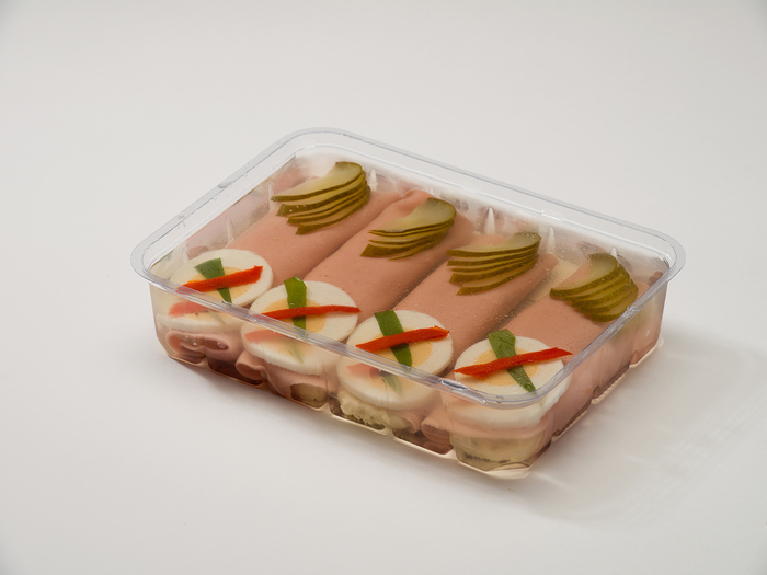 Složení: aspik minimální množství 50% (voda, ocet, želatina, cukr, sůl), bramborová pomazánka (brambory, majonéza /řepkový olej, voda, vaječné žloutky, ocet, zahušťovadla //modifikovaný škrob, guma guar, xanthan, karubin//, sůl, konzervant E202/, sterilovaná cuketa /cuketa, voda, ocet, cukr, sůl, extrakt koření/, cibule, hořčice plnotučná /voda, hořčičné semínko, ocet, cukr, sůl, konzervant E211, barvivo E160a/, sůl, cukr, worcestr omáčka /voda, ocet, cukr, sůl, víno, švestková povidla //švestky, jablka, pektin, E330//, směs koření, barvivo E150d, sušený rajčatový protlak, aromata, chilli extrakt, česnekový extrakt/, směs koření, bioprotektor a antioxidant Biamex 012 /směs kyselých mléčných kultur, uhlohydrátů, soli a výtažků z koření/), výrobní salám (drůbeží maso strojně oddělené 38%, voda, vepřové kůže, bramborový škrob, sůl, stabilizátor E450, E451, E250, barvivo E120, E150c, antioxidant E300, E301, E330, zvýrazňovač chuti E621, protispékavá látka E551, dextróza, koření, aroma), sterilované okurky a paprika červená (zelenina, voda, ocet, sůl, extrakt koření, sladidlo E954), vejce (nálev: regulátor kyselosti E260, E270, E330, antioxidant E325, ocet).